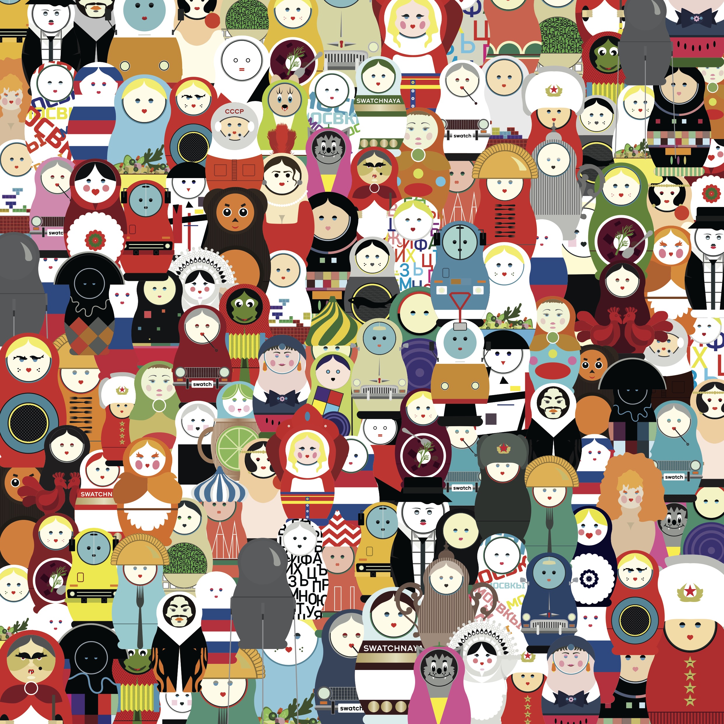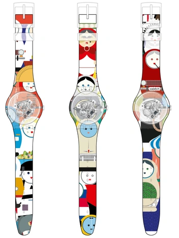 Художник OUMA, благодаря медицинскому образованию, создает картины, состоящие из перекликающих сегментов наподобие клеток в организме; а на работах иллюстратора YOSHI 47 всегда можно найти радостные физиономии разных цветов и форм. Полотна Towmei-Line напоминают фотоколлажи, на которых изображены животные, и их единение с человеком, а Chocomoo под влиянием рок-музыки и хип-хопа создает работы в фирменном черно-белом стиле штриховой графики. Часы с этими паттернами можно приобрести исключительно в поп-ап Swatch в ГУМе.
