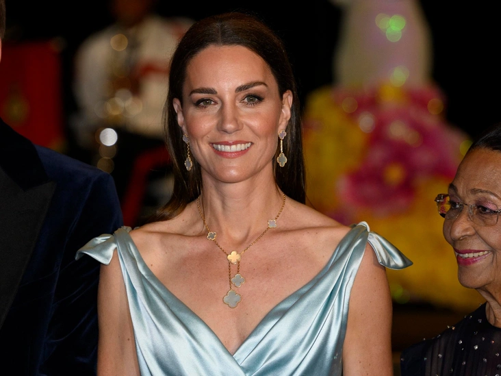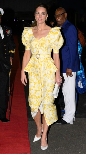 Самым дорогим во всем туре считается голубое платье Phillipa Lepley в стиле Золушки. Прекрасный вечерний туалет из сатина стоил 6500 фунтов стерлингов, и в тотальный чек за этот выход не вошла стоимость украшений Van Cleef & Arpels, так как Кембриджская уже появлялась в них раньше. Зато клатч Lulu Guinness за 225, идеально совпадающий по оттенку с голубым сатиновым платьем, был новым, и его стоимость была приплюсована экспертами к цене за вечерний выход на прием у генерал-губернатора Багам, составившей 6725 фунтов стерлингов.