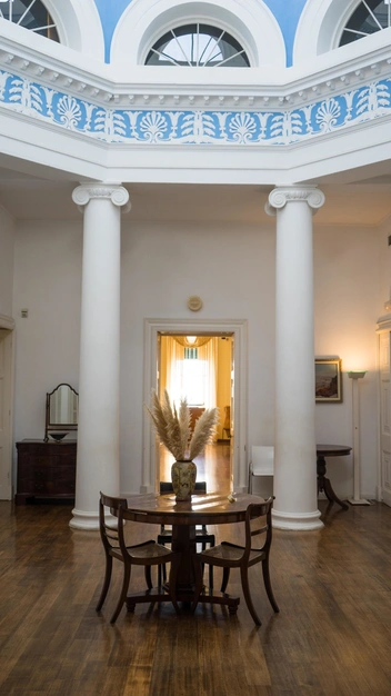 В холле расположены несколько колонн и висит внушительная хрустальная люстра. А лестницу, ведущую к верхним этажам, дополняют замысловатые перила из кованого железа (читайте также: Особый шик: как выглядят гостиные королевских особ).