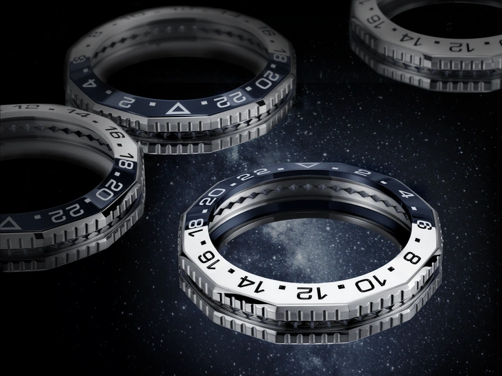 Двухцветный, вращающийся в обоих направлениях безель отлит из керамики, устойчивой к царапинам и выцветанию. Кроме того, чтобы определить день или ночь, безель окрашен в два цвета: темно-синии соответствует ночному времени с 6 вечера до 6 утра; а ярко-белый обозначает дневные часы с 6 утра до 6 вечера. Для точности и легкой считываемости показателей 24-часовая шкала по Гринвичу выгравирована на керамике контрастными цветами: черным для дневного времени и белым для ночного.