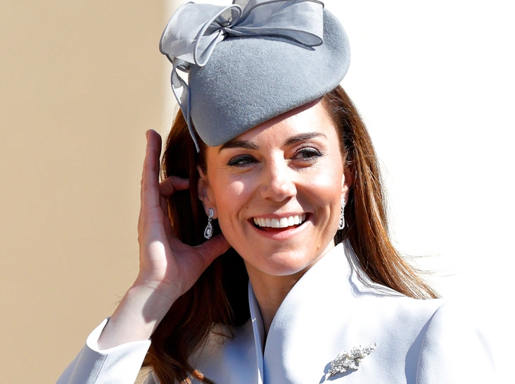 Королевские обозреватели обратили особое внимание на образ герцогини - для службы Ее Высочество предпочла светло-голубой наряд от Alexander McQueen, шляпку от Jane Taylor, но особенно знаковым показались украшения: серьги от Robinson Pelham, в которых Ее Высочество появляется крайне редко, и брошь в виде дубового листа.