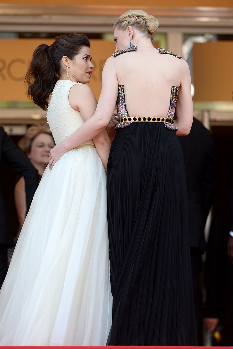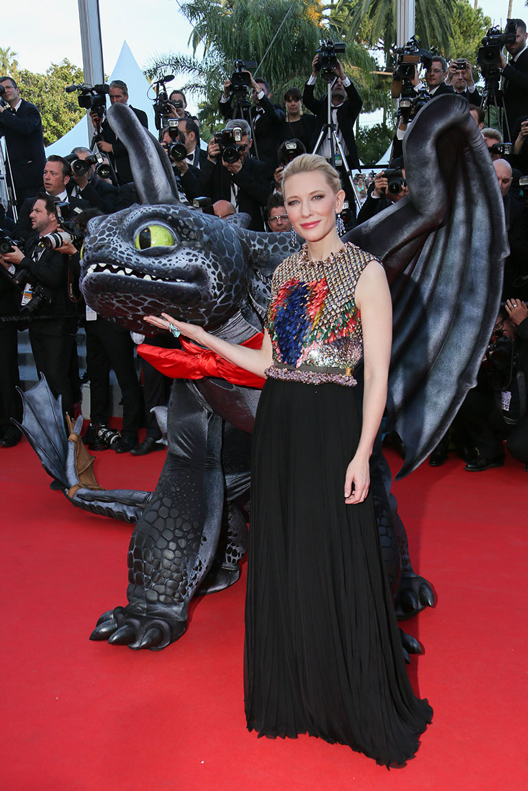 За выходные в Каннах было представлено множество фильмов и мультфильмов. Кейт Бланшетт, озвучившая одну из ролей во второй части мультфильма «Как приручить дракона-2», выбирала для ковровой дорожки исключительно те наряды, которые напоминают о блестящей чешуе дракона, – на фотоколле она предстала в брючном костюме с крупной ажурной окантовкой, а на премьеру приехала в переливающемся платье Givenchy.