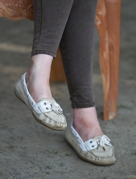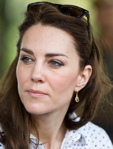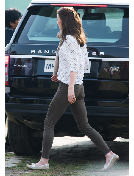 Любительница переодеваний герцогиня Кембриджская успела каким-то чудом дважды сменить наряд. Во время прогулки на ней были цвета хаки облегающие , стоимостью всего 30 английских фунтов, и молочно-белая свободная блузка с мелким принтом. Образ любительницы сафари был дополнен любимыми мокасинами Sebago, очками Ray-Ban и самыми знаменитыми «повседневными» , стоимостью 495 фунтов.