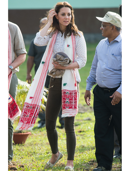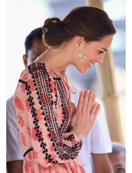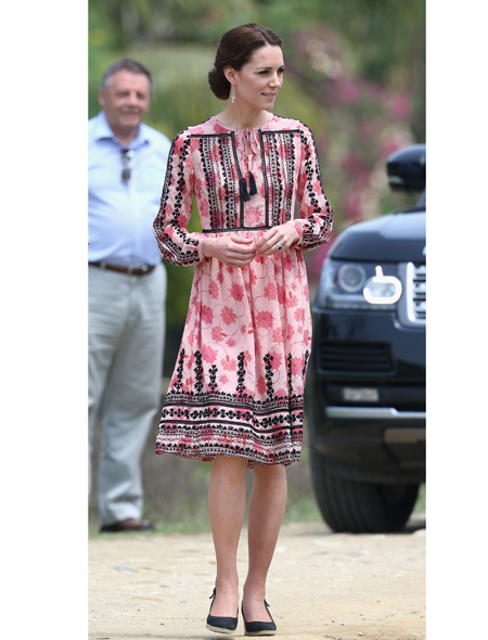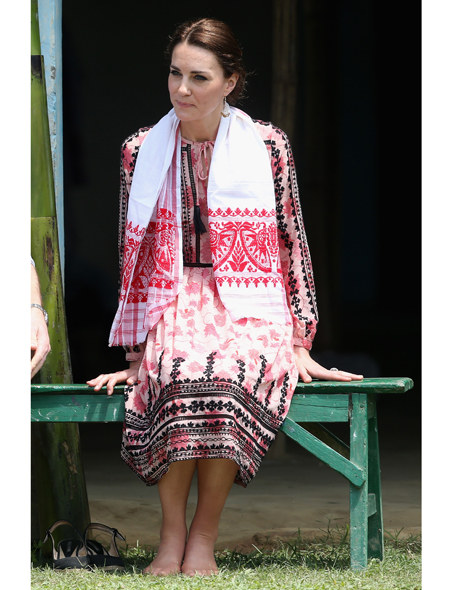 Однако для встречи с местными жителями Кейт сменила брюки на . Красно-белое с черной вышивкой платье в бохо-стиле еще утром можно было купить в интернет-магазине за скромные £75, а теперь (кто бы удивлялся?) полностью распродано. Дополнить скромный образ селянки были призваны уже известные нам 8-фунтовые сережки из Accessorize. На ногах герцогини были «дежурные» для повседневных выходов эспадрильи на танкетке (которую так не любит королева Елизавета II). Один раз Кейт снова пришлось разуться, к с лову, но такого ажиотажа, как в прошлый раз, босые ноги жены принца Уильяма уже не вызвали.