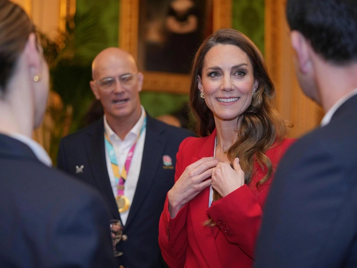 Прием королевская особа провела в честь женской сборной Англии по регби, которая выиграла Кубок мира в сентябре прошлого года. Для этого события Кейт выбрала красный брючный костюм от Alexander McQueen, туфли от Gianvito Rossi, жемчужные золотые серьги от Katherine James и гранатовое колье от Auree London.