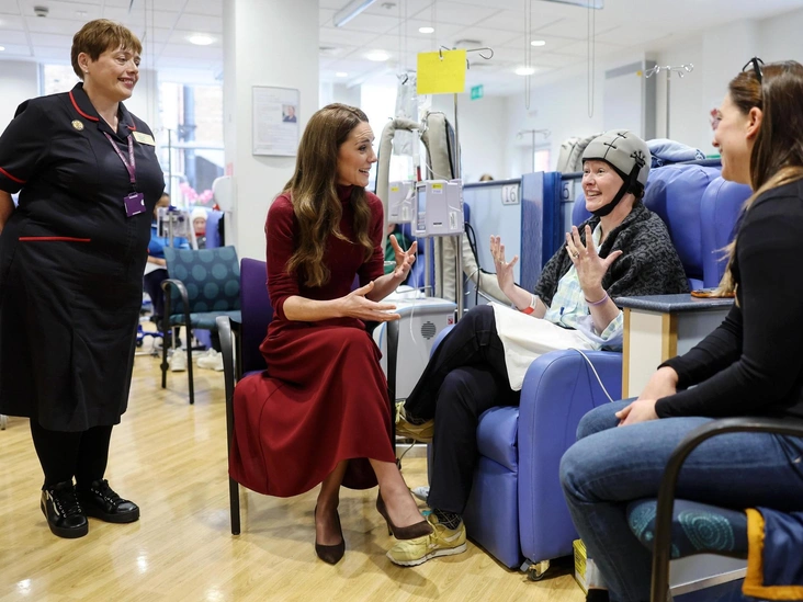 Она также поделилась с пациентами и персоналом историей о своей «действительно жесткой» химиотерапии. Разговаривая с Кэтрин Филд, проходившей свой первый курс лечения, Кейт жестом указала на собственную руку и грудь, чтобы обсудить порт-систему для доставки лекарства.