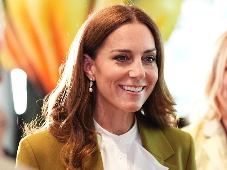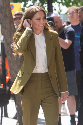 Для этого события королевская особа надела необычный образ: оливковые жакет и брюки Victoria Beckham. Их она предпочла дополнить белой блузкой с рюшами, коричневыми лодочками и лаконичными серьгами.