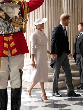 Маркл была одета в жемчужно-белое пальто с поясом и подходящую шляпу, а принц Гарри примерил классический костюм, украшенном медалями за военную службу. Поговорив с военнослужащими на ступенях исторического собора, они заняли свои места внутри собора.