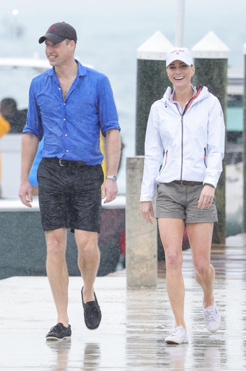 Для морской прогулки Кейт выбрала идеальное белое поло с темно-синей окантовкой на лацканах и рукавах, а также очень короткие спортивные шорты цвета хаки, дополненные плетеным коричневым ремнем, белыми кроссовками Superga и легкой ветровкой. Уильям также выбрал максимально расслабленный аутфит и был одет в синюю рубашку на пуговицах, темно-синие шорты, которые он сочетал с практичной обувью и бейсболкой.