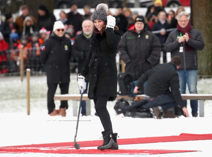 Для визита на арену Кейт облачилась в черное пальто от Burberry, черные брюки, вишневый свитер от шведского бренда Fjallraven и спортивные ботинки от канадской марки Sorel с весьма скромной по королевским меркам ценой – 130 долларов или 7300 рублей. Дополнила ее наряд (впрочем, как и наряд Уильяма) шапка с помпоном – однозначный тренд этой зимы.