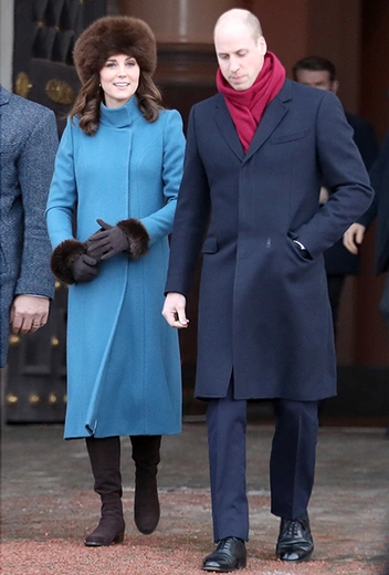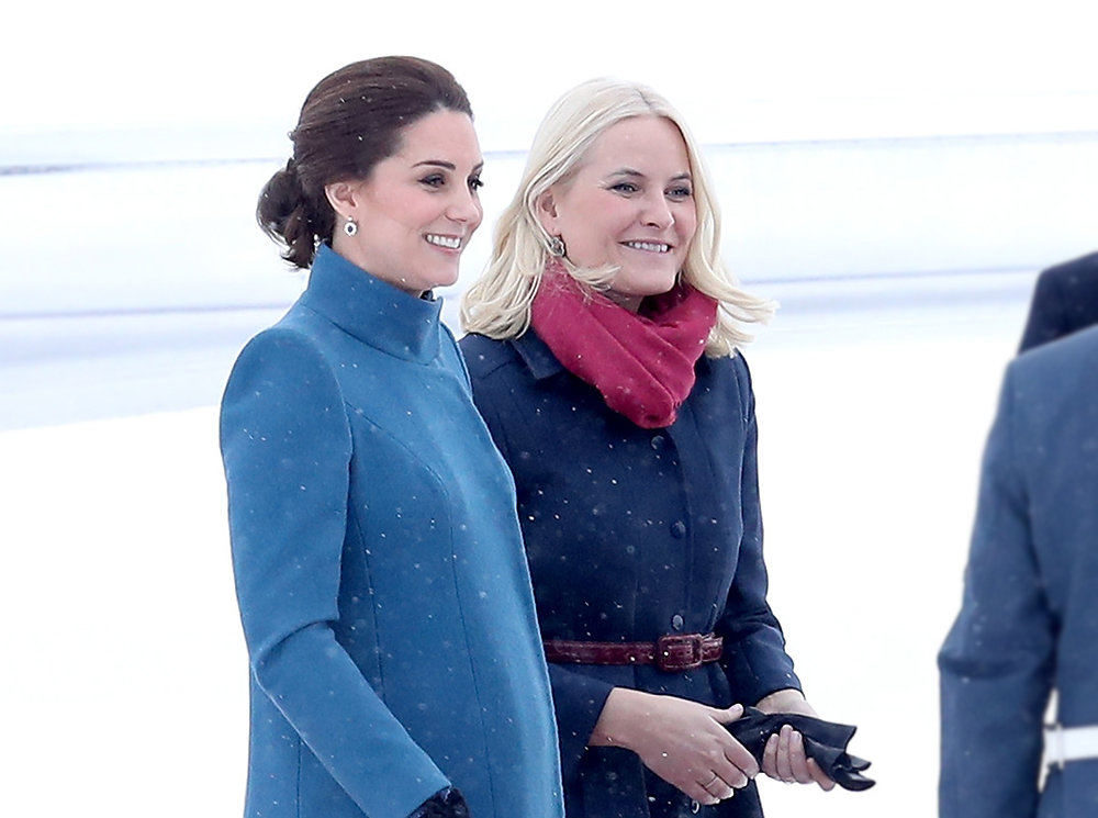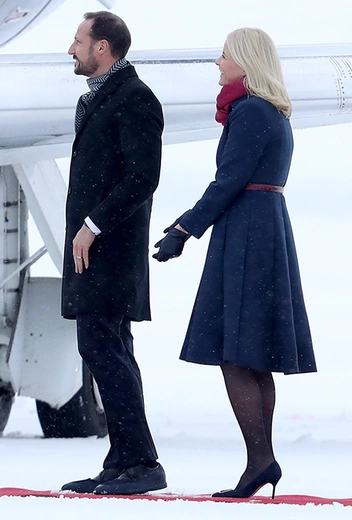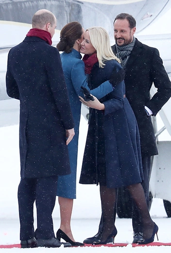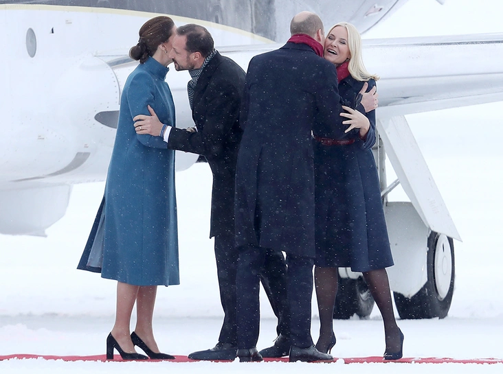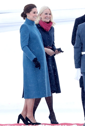 Для встречи в заснеженном аэропорту Кэтрин выбрала голубое пальто от Catherine Walker, платье от бренда одежды для будущих матерей Séraphine и... туфли. Удивила и Метте-Марит, представ в лодочках на тонкой шпильке: несмотря на постеленную для гостей красную ковровую дорожку, сугробы вокруг все равно заставляют переживать о здоровье двух будущих королев. Интересно, что синее пальто в сочетании с красным шарфом норвежской кронпринцессы оказались очень синонимичны наряду принца Уильяма.