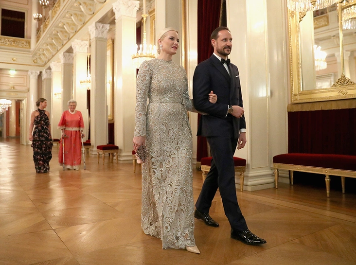 Кейт появилась в светло-розовом платье с серебристой вышивкой от Alexander McQueen, принятое поклонниками герцогини куда теплее, чем ее вечерние наряды в Стокгольме. Метте-Марит предпочла кружевное серебристое платье, которое, впрочем, норвежской кронпринцессе тоже очень идет.