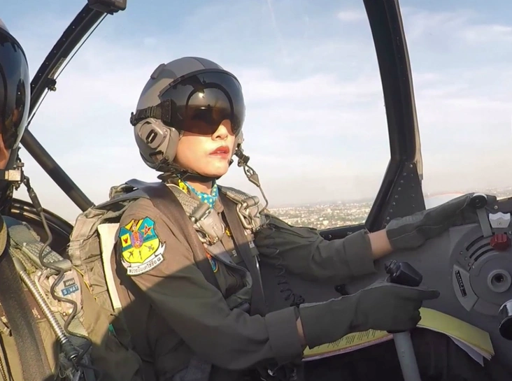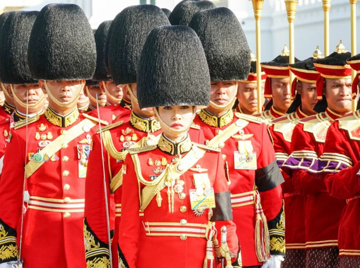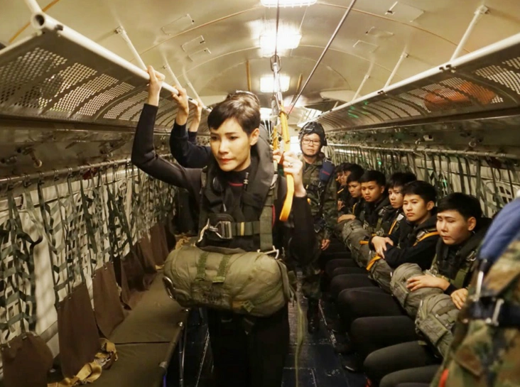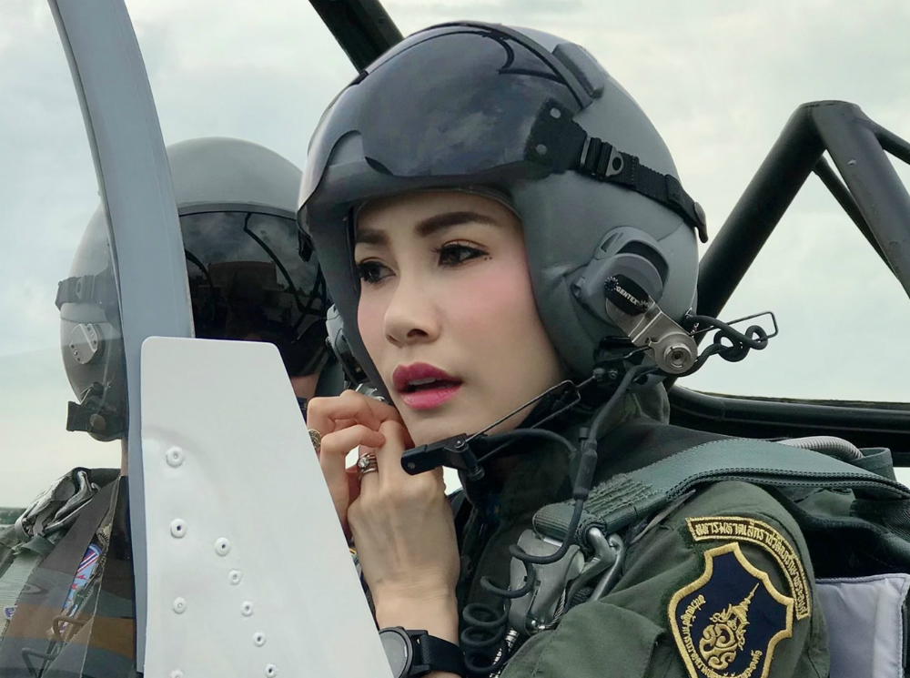 На одной из фотографий Синеенат запечатлена в кабине военного самолета, на других снимках — в камуфляжной форме в компании с королем, на третьей — в парадной одежде, стоящей у подножия королевского трона и держащей монарха за руку.