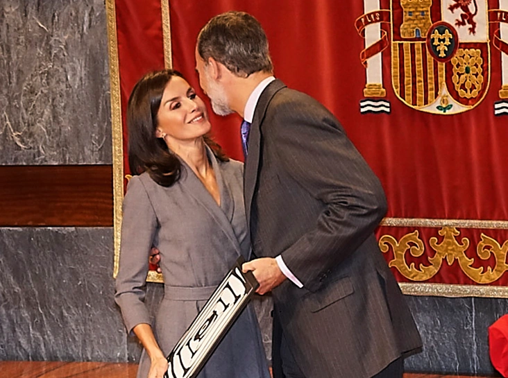 Но самым запоминающимся моментом церемонии стал нежный жест короля по отношению к супруге. На сцене награду Летиции вручил сам Филипп VI, который был так горд за жену, что даже позволил себе продемонстрировать чувства на публике – поцеловал королеву Летицию в щеку.