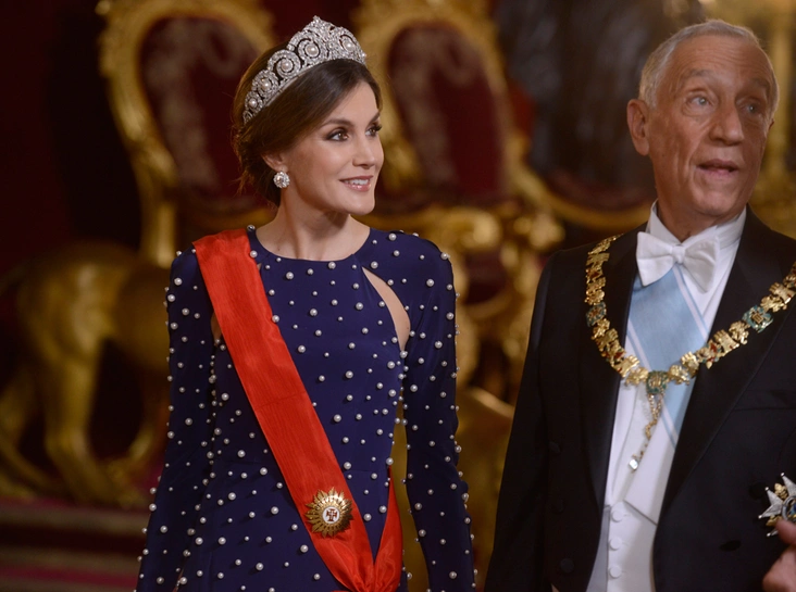 Не менее экстравагантно испанская королева выглядела и во время приема президента Португалии 16 апреля. В тот день Летиция выбрала не совсем отвечающее дворцовым традициям платье от Ana Locking с вырезами в районе подмышечных впадин. Впрочем, возможно, в тот вечер куда больше внимание привлекала тиара женщины, которую ей любезно одолжила свекровь.
