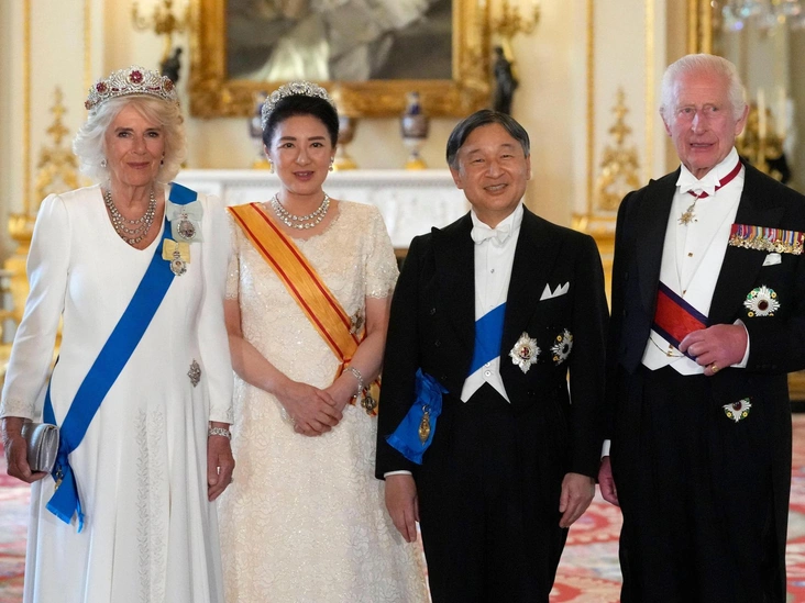 На банкете с императорской парой королева Камилла появилась в белом платье в пол с длинными рукавами и V-образным вырезом, с серебряным клатчем, а также потрясающей рубиновой тиарой из коллекции Елизаветы II. Рубины когда-то были подарены Елизавете II жителями Бирмы, как символ здоровья и процветания. Монарх сделала из них тиару лишь в 1973 году и надевала ее вплоть до своей смерти. На королевском банкете были и другие, не менее потрясающие образы, про которые мы рассказали в нашем материале (читайте также: Парад тиар в Лондоне: три самых роскошных украшения британской и японской королевских семей).