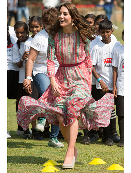 После завершения Кейт представилась возможность продемонстрировать свои изящество и ловкость, умело орудуя крикетной клюшкой. Конечно же, популярная и любимая всеми королевская особа не могла появиться на поле в неприглядной одежде. Сегодня на радость собравшихся журналистов и фотографов и на глазах у тысячи индийских детей герцогиня Кембриджская предстала в легком платье длиной до икры, в стиле бохо-шик, приглушенных красно-зеленых оттенков с флористическими узорами и каплевидым вырезом-застежкой на шее. Своим выбором Кэтрин подтвердила наши догадки, что среди ее нарядов обязательно будут фигурировать вещи индийских брендов. Так и есть: данное платье - творение , весьма популярного среди звезд Болливуда. К слову, наряд этот можно отнести к категории недорогих выборов Кэтрин - заплатить 237 долларов может себе позволить большинство поклонниц стиля герцогини. Дело за малым:. Ну а на ногах супруги принца Уильями красовались туфли на танкетке. Невооруженным глазом видно, что это - не что иное, как любимые лодочки Кейт бренда Stuart Weitzman.
