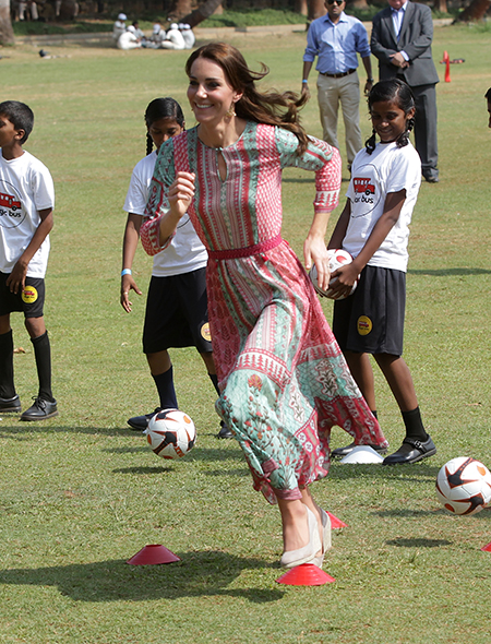 После завершения Кейт представилась возможность продемонстрировать свои изящество и ловкость, умело орудуя крикетной клюшкой. Конечно же, популярная и любимая всеми королевская особа не могла появиться на поле в неприглядной одежде. Сегодня на радость собравшихся журналистов и фотографов и на глазах у тысячи индийских детей герцогиня Кембриджская предстала в легком платье длиной до икры, в стиле бохо-шик, приглушенных красно-зеленых оттенков с флористическими узорами и каплевидым вырезом-застежкой на шее. Своим выбором Кэтрин подтвердила наши догадки, что среди ее нарядов обязательно будут фигурировать вещи индийских брендов. Так и есть: данное платье - творение , весьма популярного среди звезд Болливуда. К слову, наряд этот можно отнести к категории недорогих выборов Кэтрин - заплатить 237 долларов может себе позволить большинство поклонниц стиля герцогини. Дело за малым:. Ну а на ногах супруги принца Уильями красовались туфли на танкетке. Невооруженным глазом видно, что это - не что иное, как любимые лодочки Кейт бренда Stuart Weitzman.