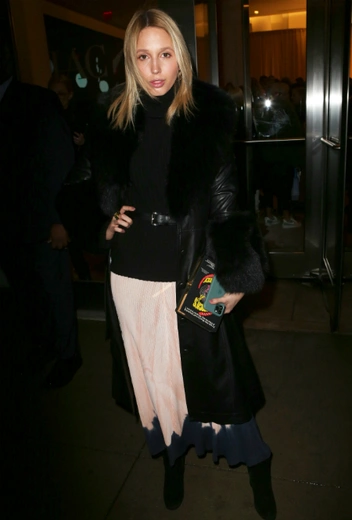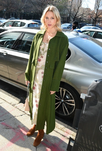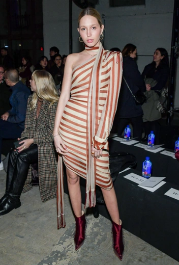 На текущей модной неделе Мария-Олимпия посетила самые обсуждаемые показы – шоу Monse, где она позировалафотографам, сидя в первом ряду вместе со своей двоюродной сестрой Талитой фон Фюрстенберг, дочерью культового дизайнера Дианы фон Фюрстенберг. Для показа Мария-Олимпия выбрала асимметричное платье в бело-красную полоску, которое дополнила розовыми ботильонами.