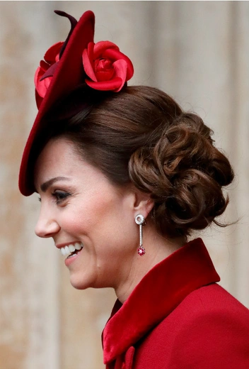 В 2020 году на службу в честь стран Содружества герцогиня прибыла в красном пальто, алой шляпке и паре сережек с рубиновыми цветками на бриллиантовой основе. Очень похожее сочетание, но в куда более помпезном исполнении можно увидеть на Бирманской тиаре Ее Величества. Она была изготовлена ювелирным домом Garrard из рубинов, преподнесенных Елизавете народом Бирмы на ее свадьбу в 1947 году.