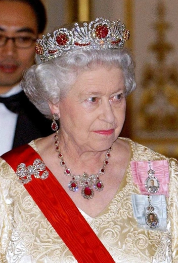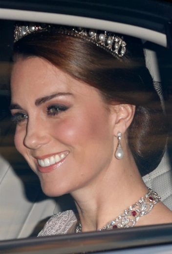 Также в коллекции Ее Величества есть несколько массивных колье с рубинами, которые дополняют тиару. А вот в личной коллекции Кейт колье с рубинами куда более лаконичные и современные — с первого года замужества она носит модель из того же гарнитура, что и вышеупомянутые серьги (также в комплекте шел браслет). Для государственного приема испанского короля Филиппа в Букингемском дворце в июле 2017 супруга принца Уильяма одолжила эффектное колье Boucheron с деликатными вкраплениями рубинов из коллекции Елизаветы, которое будущий монарх получила в качестве свадебного подарка от родителей. На Кейт оно отлично смотрелось вместе с тиарой «Узелки любви».