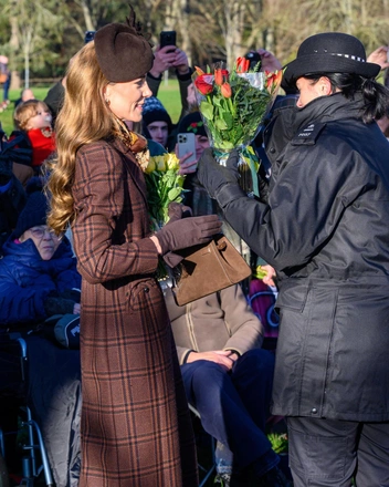 Начнем с образа принцессы Уэльской. На этот раз нас ждал повтор — Кэтрин надела любимое шоколадное пальто Blaze Milano, в котором ранее появлялась уже 4 раза. Его она дополнила сапогами Gianvito Rossi, сумкой Demellier London и шляпкой Juliett Botterill. Из аксессуаров она также осталась верна своим фаворитам, так что завершила наряд серьгами Cartier, которые носила весь этот год, и платком Really Wild Clothing.