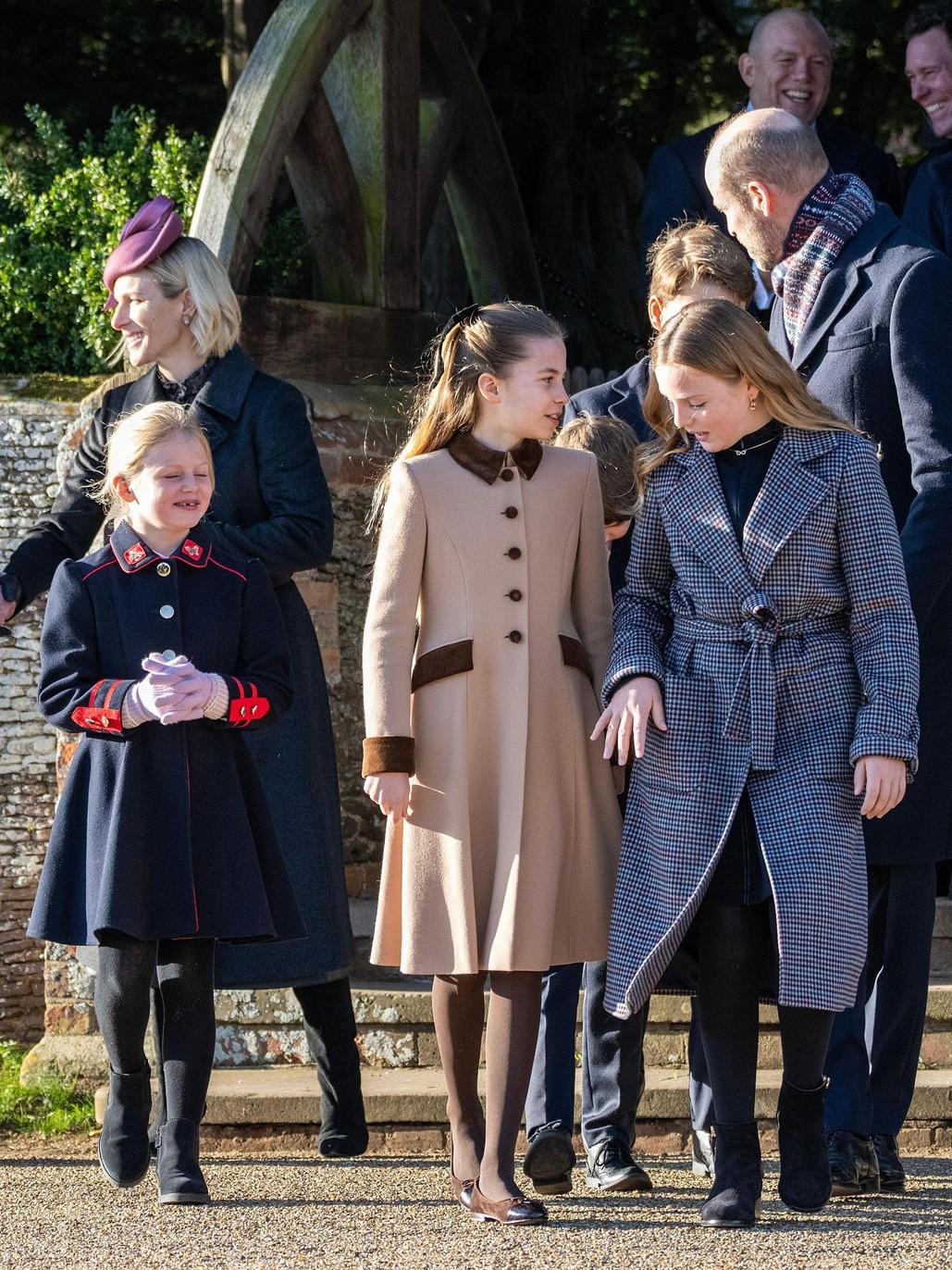Зара вышла на публику в темном пальто с розовой шляпкой Justine Bradley-Hill и ботинками на каблуке L.K. Bennett. Ее старшая дочь была в сером плаще с поясом и черной водолазке. А вот младшая носила пальто, которое буквально досталось ей по наследству. Ранее в 2022 году в нем уже ходила ее сестра Миа, а в 2017-м году в том же образе видели Саванну Филиппс.
