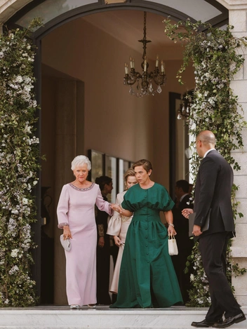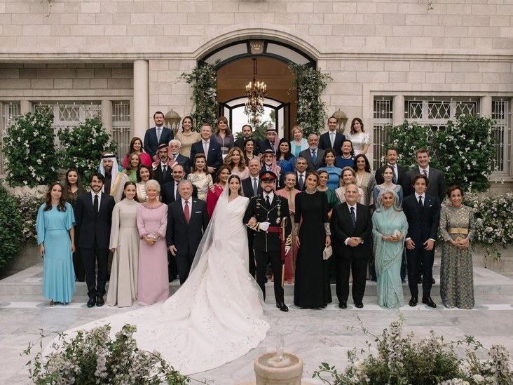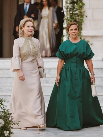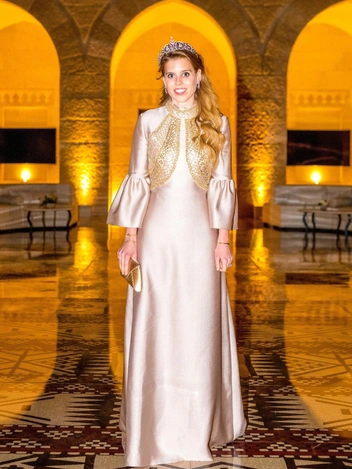 Иорданская принцесса Айша, выбравшая тот же наряд для дневной части торжества, дополнила его остроносыми бежевыми туфлями, клатчем с вышивкой, практически совпадающим с платьем, и золотыми серьгами. Свои светлые волосы тетя жениха оставила распущенными. Кстати, любопытно, что у принцессы Айши тоже британские корни. Их с королем Абдаллой мать принцесса Муна родилась в Англии, в графстве Саффолк, ее отец был военным и переехал в Иорданию по работе. Принцесса Муна присутствовала на торжестве внука и была запечатлена в светло-лиловом платье.