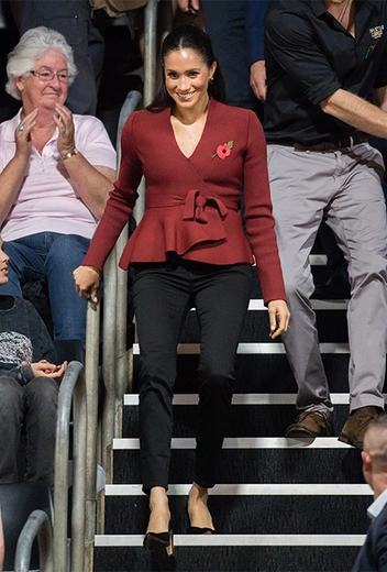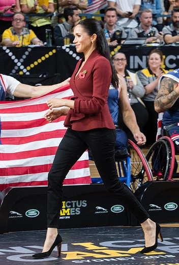 Меган вновь воспользовалась приемом модной дипломатии, выбрав жакет австралийского бренда Scanlan Theodore насыщенного цвета бургунди.