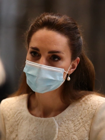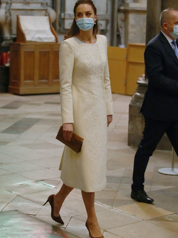 Модные обозреватели обратили внимание на то, что герцогиня была одета в пальто молочного оттенка длиной до колен, вызывая ассоциации со своим свадебным платьем, впечатлившим весь мир почти десять лет назад. Это модель Valeria одного из любимейших дизайнеров Кейт Catherine Walker. Оно изготовлено из мягкой шерсти кремового цвета и украшено кружевными вставками, определившими необычную форму запаха. Пальто Кэтрин дополнила небольшой сумочкой Métier London из коричневой замши и соответствующими ей остроносыми туфлями Jimmy Choo модели Romy. За одноразовой медицинской маской на герцогине можно было рассмотреть жемчужные серьги Annoushka Baroque Pearl Drops.
