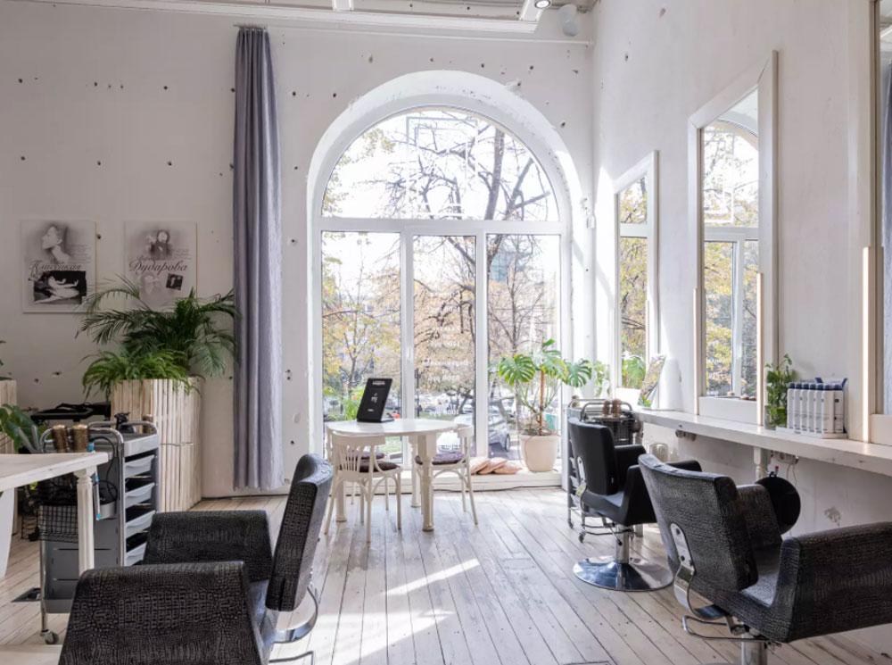 Помимо клиентских услуг хочется поближе ознакомиться с самим пространством R-LEGEND. Оно находится в очень необычном и исторически важном помещении — главный зал Союза Композиторов Советского времени, ныне адаптированный новыми дизайнерскими решениями в стиле «город сад». Просторное светлое место с панорамными окнами, украшенное растениями и цветами, создает поистине летнюю атмосферу тепла и уюта.