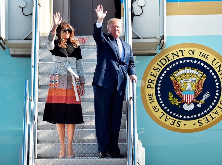 Чета Трампов отправилась в турне по странам Азии. Первой в списке стала Япония. На выходных президент с супругой прибыл в Токио. И, как и во время визита в Польшу прошедшим летом, Первая леди слегка перестаралась с цветовыми пятнами в своей одежде. Мелания вышла из самолета в красивом вязаном пальто Fendi, выполненном в стиле color-block.