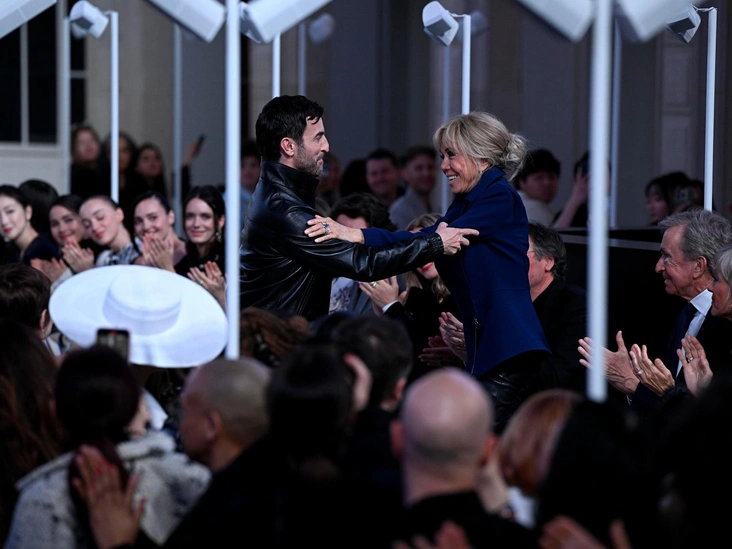 В финале шоу, когда на подиум вышел креативный директор бренда Николя Жескьер, Брижит Макрон не смогла скрыть эмоций: она быстро поднялась со своего места, чтобы тепло обнять и поцеловать его. Конечно, такой импульсивный порыв — большая редкость для первой леди. Тем не менее, он совсем неудивителен: Макрон давно отдает предпочтение именно этому бренду. Louis Vuitton создавал ей костюмы для десятков важных мероприятий, в том числе для повторной инаугурации ее супруга Эммануэля Макрона в 2017 году. Так что наряды этой марки — элегантные и выдерживающие грань между эффектностью и сдержанностью — давно стали визитной карточкой ее стиля.