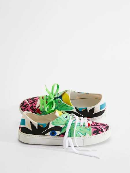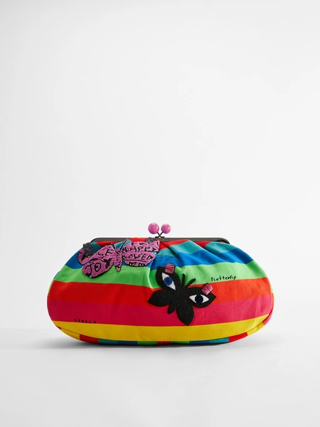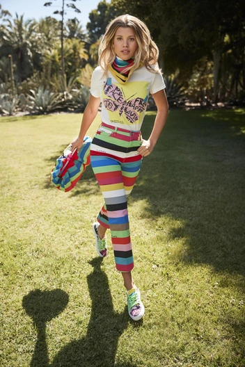 Подобным же образом эклектичный художник заново интерпретирует свой узнаваемый любимый материал, клейкую ленту, как яркие хлопчатобумажные полоски, которые подчеркивают талию и горловину на платьях, блузках и юбках-карандаш. В результате вещи словно склеены вместе этой лентой, как говорит Робертсон. Кроме бабочек, коллекцию украшают стилизованные девушки Flutterfly, яркие полоски, вдохновленные клейкой лентой, и принты с образцами извилистого почерка Робертсона. Все эти яркие узоры отображены и на культовой сумке Pasticcino Bag, и на забавных кроссовках.