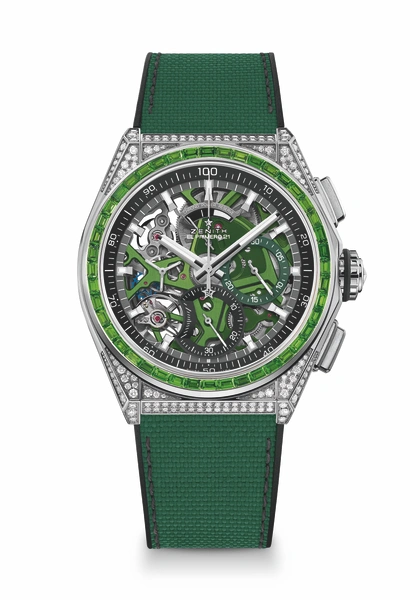 Ослепительная коллекция DEFY 21, названная Spectrum в честь диапазона цветов, создаваемых различными длинами волн видимого света, состоит из пяти моделей. Общим элементом для них стал 44-миллиметровый корпус из нержавеющей стали, полностью украшенный 288 блестящими белыми бриллиантами. Каждая версия оснащена безелем с 44 драгоценными камнями багетной огранки различных оттенков: зеленые цавориты, оранжевые и синие сапфиры, фиолетовые гранаты и черная шпинель. А в тон к ним подобраны механизмы подходящего цвета и каучуковые ремешки. Коллекция DEFY 21 Spectrum ограничена 10 экземплярами и доступна в бутиках Zenith по всему миру.