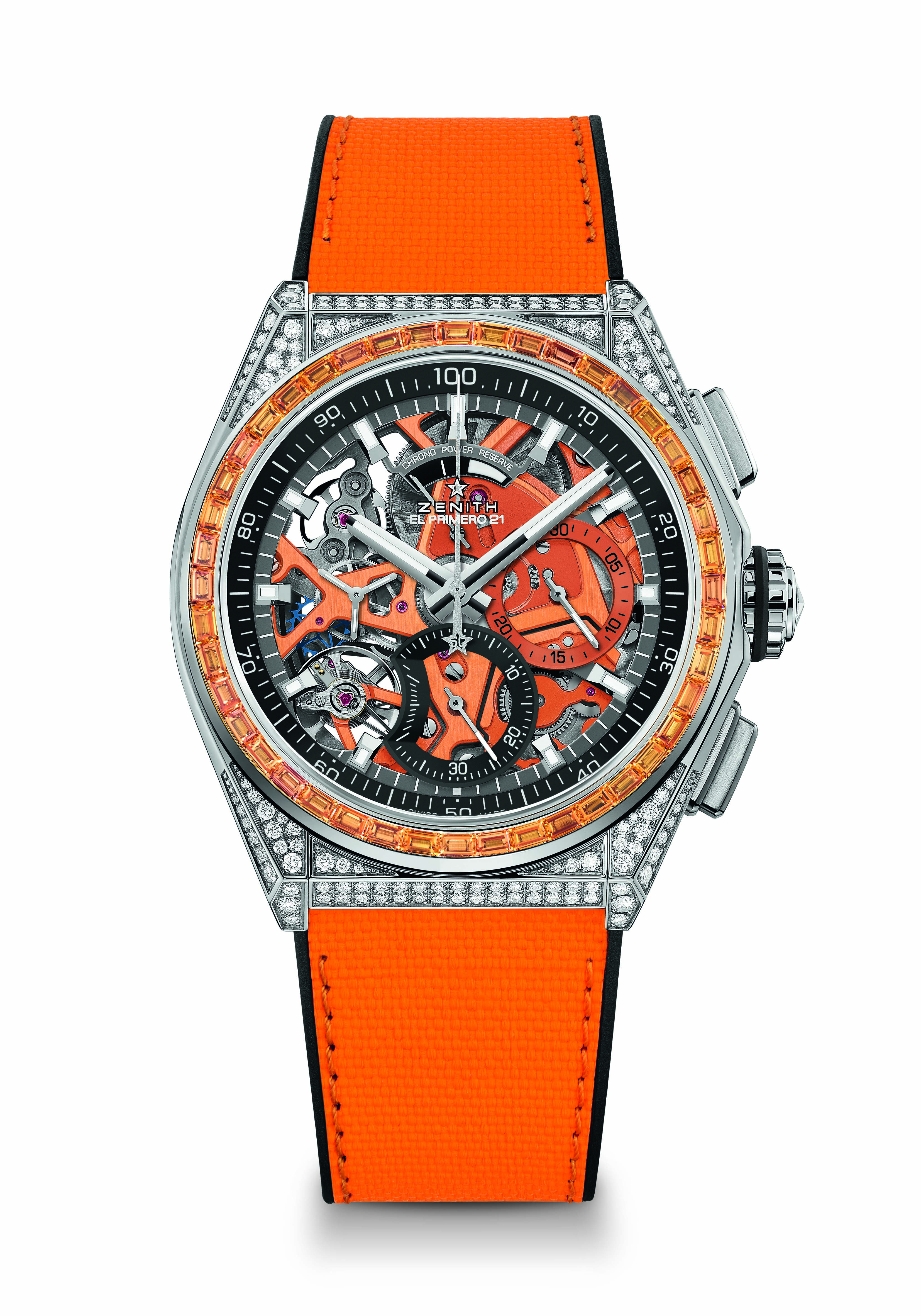 В основе этой яркой эксклюзивной коллекции лежит El Primero 21 — революционный калибр хронографа Zenith с точностью 1/100 секунды, который работает с поразительной скоростью 50 Гц (360 000 полуколебаний в час). Самый быстрый хронограф в производстве и единственный, который точно и разборчиво измеряет и отображает измерения времени, El Primero 21 стал новой важной ступенью для бренда.
