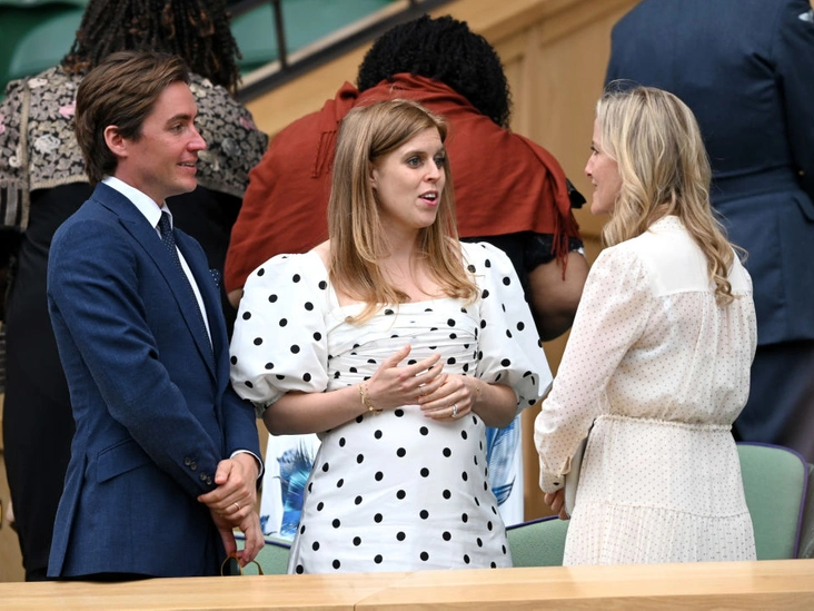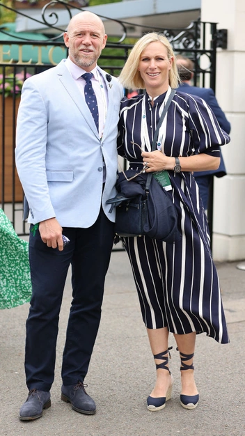 Запомнились поклонникам и образы беременной принцессы Беатрис и Зары Тиндолл. Йоркская блистала в платье в крупный горох с объемными рукавами от Self-Portrait, а Тиндолл предпочла продольную полоску (и не прогадала). Особенно стильно платье-халат внучки королевы смотрелось в «комплекте» с аутфитом ее супруга Майка, с которым Зара очевидно скооперировала оттенки.