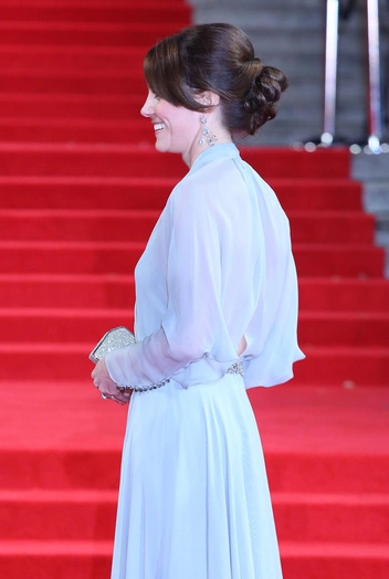 Мы говорим о выходе Кейт на премьере очередной части «Джеймса Бонда» в Королевском Альберт-Холле в 2015 году, куда принцесса прибыла в компании мужа и принца Гарри. В тот день Кэтрин надела нежно-голубое платье Jenny Packham в необычном для себя крое — с длинными летящими и полупрозрачными рукавами и глубоким вырезом на спине. Наряд настоящей принцессы сопровождался длинным шлейфом, а также акцентом на талии в виде страз и жемчуга. К слову, вырез был не только на задней части платья — зона декольте Кэтрин тоже была приоткрыта.