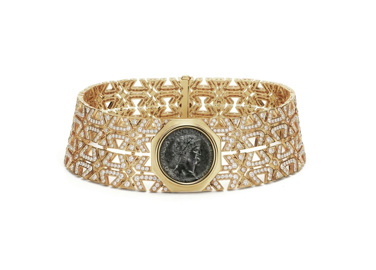 Знаменитые высокоювелирные изделия Bvlgari коллекции Monete обретают новую интерпретацию в версии Monete Weave. Превосходно сохранившаяся старинная бронзовая монета с изображением грозного профиля римского императора Нерона, заключенная в восьмиугольный бейзель, определяет центр чокера. Изготовленная из золота, покрытого бриллиантами, его удобная и гибкая структура, на создание которой потребовалось 1 400 часов ручного труда, обнаруживает графический архитектурный облик, вдохновленный объемами проектов Захи Хадид. Границы между античностью и современностью стираются.