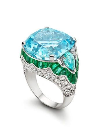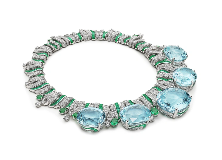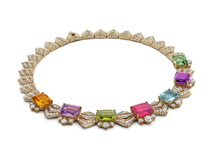 Эйфория праздника восьмидесятых годов переосмыслена сквозь фильтр современности в колье Color Legacy, демонстрирующем ритмическую композицию из разноцветных драгоценных камней и многообразие их огранок и оправ. Семь овальных аквамаринов общим весом почти 84 карата выступают в сочетании с 16 овальными рубеллитами, 32 аметистовыми кабошонами buff-top, подвергнутыми тщательной огранке в Италии, чтобы соответствовать силуэту ожерелья, 15 бриллиантами грушевидной огранки, а также бриллиантами круглой огранки и бриллиантовым паве.