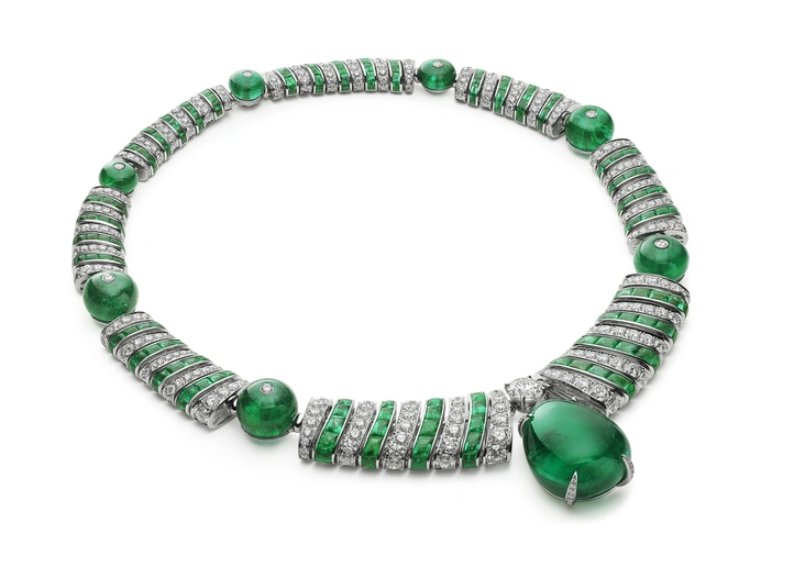 Плавность и движение — в фокусе внимания в Emerald Elipse, с замысловатым механизмом сочлененных элементов, которые гармонично передают ощущение динамичной легкости. Бриллиантовое паве и изумруды огранки buff-top образуют воздушный трубчатый узор, украшенный семью изумрудными бусинами и восхитительным центральным замбийским грушевидным изумрудом весом 62 карата. Изысканная трехмерная конструкция спиральной структуры отличает и дополняющие сет серьги.