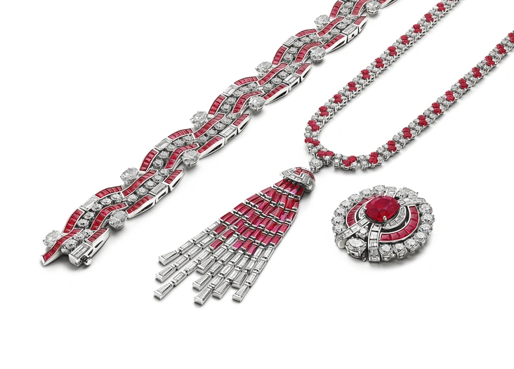 Высочайшая изобретательность и мастерство сливаются в унисон в творении Bvlgari Ruby Metamorphosis, многофункциональном украшении, которое можно носить как минимум девятью различными способами и на выполнение которого потребовалось 2 500 часов работы. Оно состоит из съемных частей, в том числе бриллиантового чокера и цепочки. Это трансформируемое произведение искусства с впечатляющим центральным рубином 10,02 карата старой огранки «кушон» из Мозамбика, а также мягкой, чувственной, шелковистой кисточкой из багетных бриллиантов и рубиновых кабошонов скрывает комплексную, сочлененную и тщательно продуманную структуру, которая позволяет легко преобразовывать его, наглядно доказывая, что воображение Bvlgari безгранично.