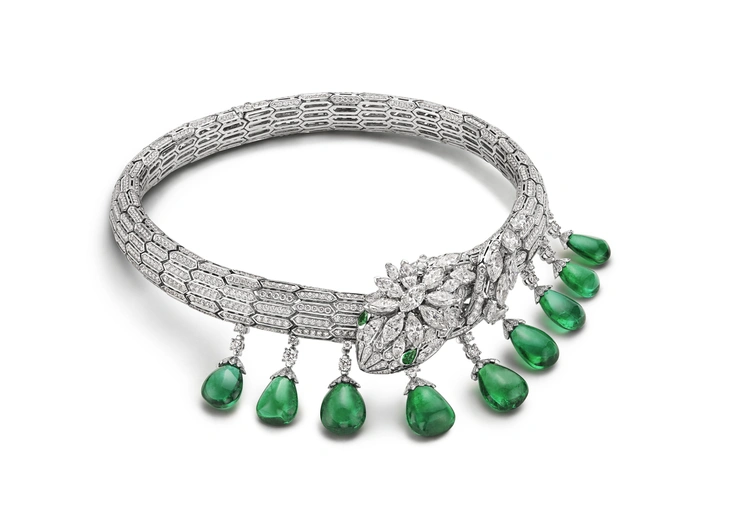 Змея, знаковый образ Bvlgari, символизирующий вечную жизнь и женскую силу обольщения, изящно и бережно хранит в своей раскрытой пасти исключительный кабошон колумбийского изумруда весом 93.83 карата, который приковывает внимание подобно взгляду змеи, формируя невероятный акцент колье Hypnotic Emerald. На его создание потребовалось 1 800 часов работы. Корпус, украшенный бриллиантовым паве, а также бриллиантовыми багетами и изумрудными кабошонами, элегантно обрамляет шею благодаря сложной, мастерски выполненной конструкции.
