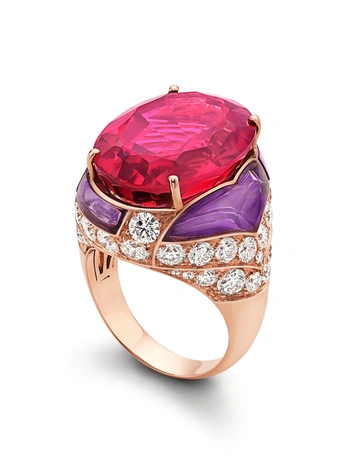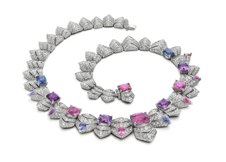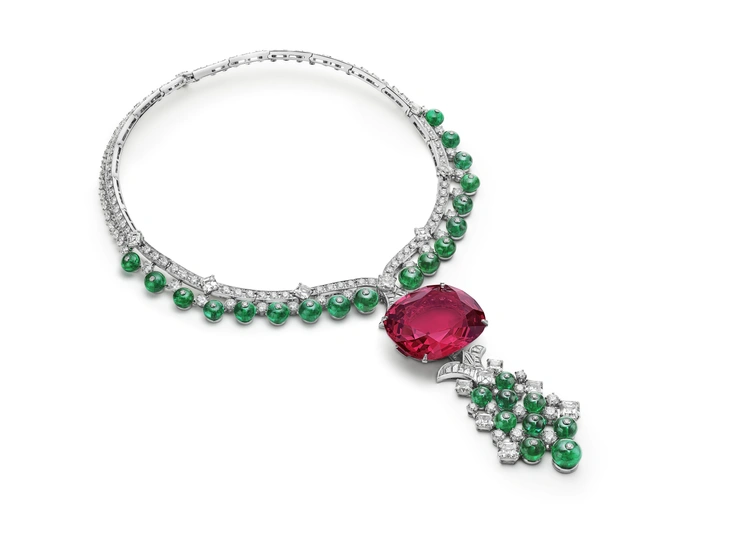 Четвертая по величине из известных в мире шпинелей, весом 131.21 карата, — главная героиня колье Imperial Spinel. Найденная в Таджикистане, она окружена каскадом бриллиантов и изумрудных бусин, в узнаваемом стиле Bvlgari, дерзко сочетающем зеленые и ярко-розовые тона. Несмотря на выдающийся размер центрального камня, это колье передает лёгкость и мягкость благодаря балансу линий и объемов.