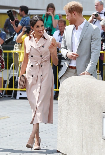 Для мероприятия герцогиня Сассекская выбрала платье-тренч от канадского бренда House of Nonie за 825 долларов, дополнив образ лодочками от Dior, сумкой от Mulberry и серьгами с белым кварцем от Birks.