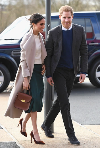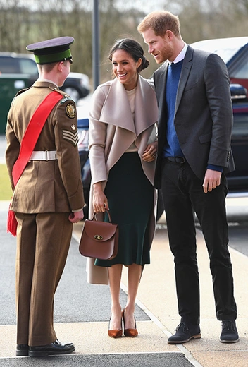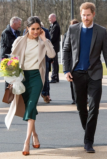Для поездки Меган выбрала светлое пальто-халат от Mackage, темно-зеленую юбку от Greta Constantine (зеленый — главный цвет Ирландии), охристые лодочки от Jimmy Choo, коричневую сумку от Charlotte Elizabeth и топ от Victoria Beckham — комплимент новой подруге Меган.