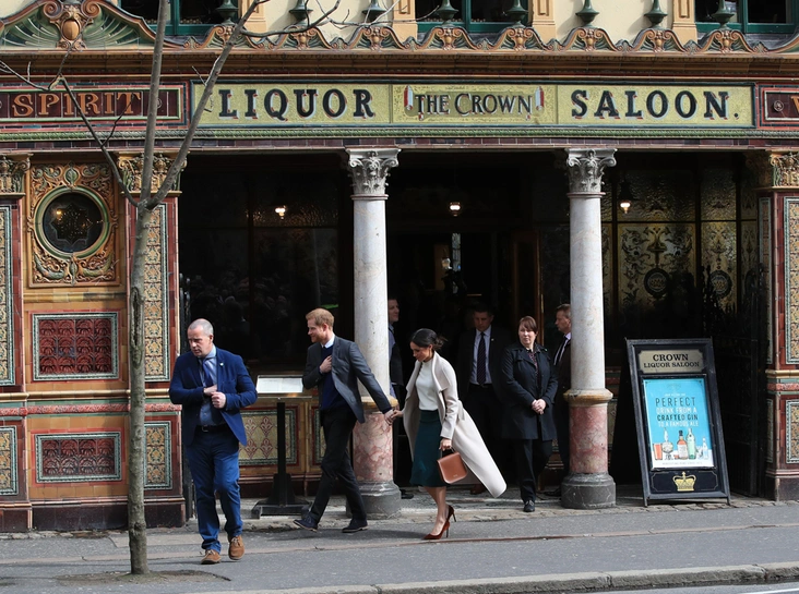 После общения с ирландской молодежью принц и его невеста прервались на ланч в атмосферном месте — Crown Liquor Saloon. Его здание по праву считается старейшим во всем Белфасте, а расположено оно на главной туристической улице города. Туристов в нем привлекает аутентичный дух викторианской эпохи: здание паба — пример того, что называют Gin Palace — яркого питейного заведения.