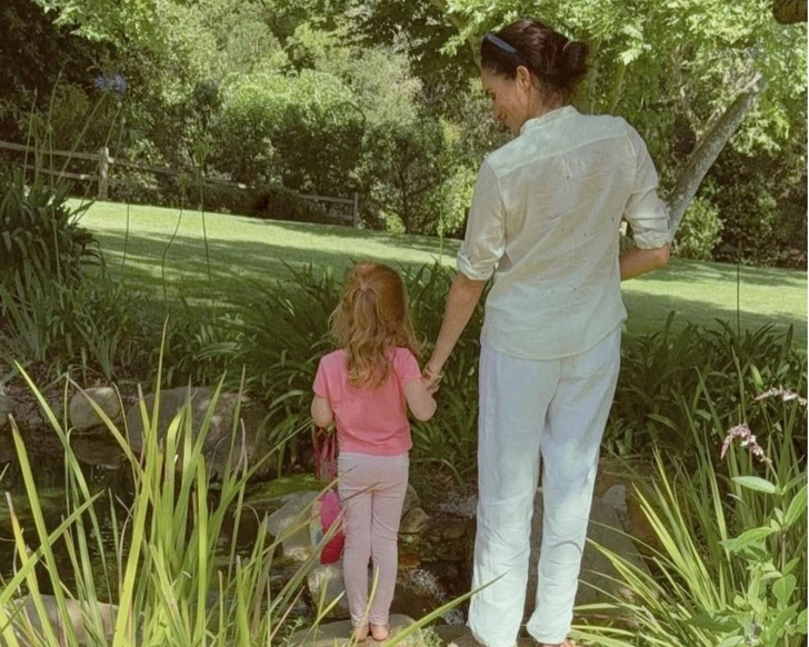 На фотографии видно, как Мега, одетая в белый льняной костюм, стоит за ручку с малышкой Лилибет, которая отдала дань любимому цвету всех девочек — розовому. Мама и дочка стоят босиком на камнях у ручья, наслаждаясь теплым днем в своем доме в Калифорнии (читайте также: Меган Маркл настаивает на своем королевском статусе, но намеренно нарушает дресс-код).