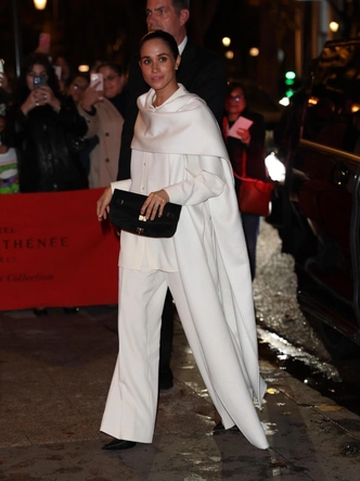 Несмотря на то, что герцогиню крайне редко можно встретить в модных кругах, похоже, она стала новой музой для бренда. Сначала Меган появилась в белоснежном костюме с накидкой авторства Пьерпаоло, а после показа переоделась в черное платье. Образ завершали черные туфли на шпильках и зализанный аккуратный пучок.