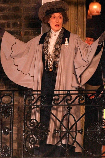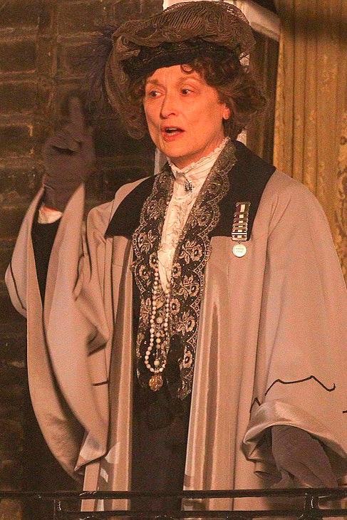 На первых неофициальных кадрах Мерил Стрип появилась на съемочной площадке фильма «Суфражистка» в сером плаще с рукавами «летучая мышь», черном платье, воротник которого отделан ажурной вышивкой, и объемной шляпе с пером. На актрису нанесли макияж, прибавляющий морщин: 64-летняя Мерил Стрип сейчас на пять лет моложе того возраста, в котором умерла Эммелин Панкхерст.